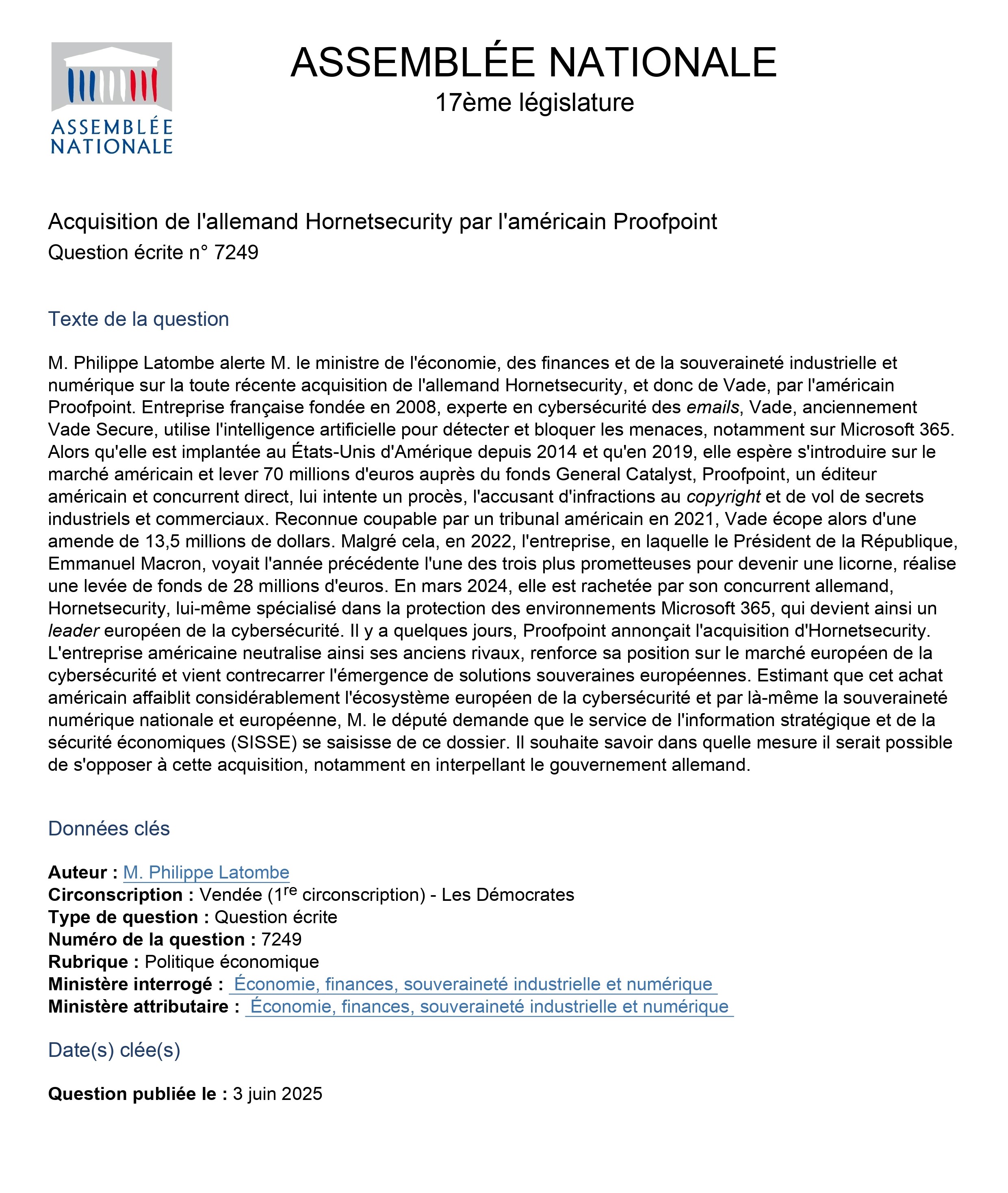 Question écrite n°7249 : Acquisition de l'allemand Hornetsecurity par l'américain Proofpoint